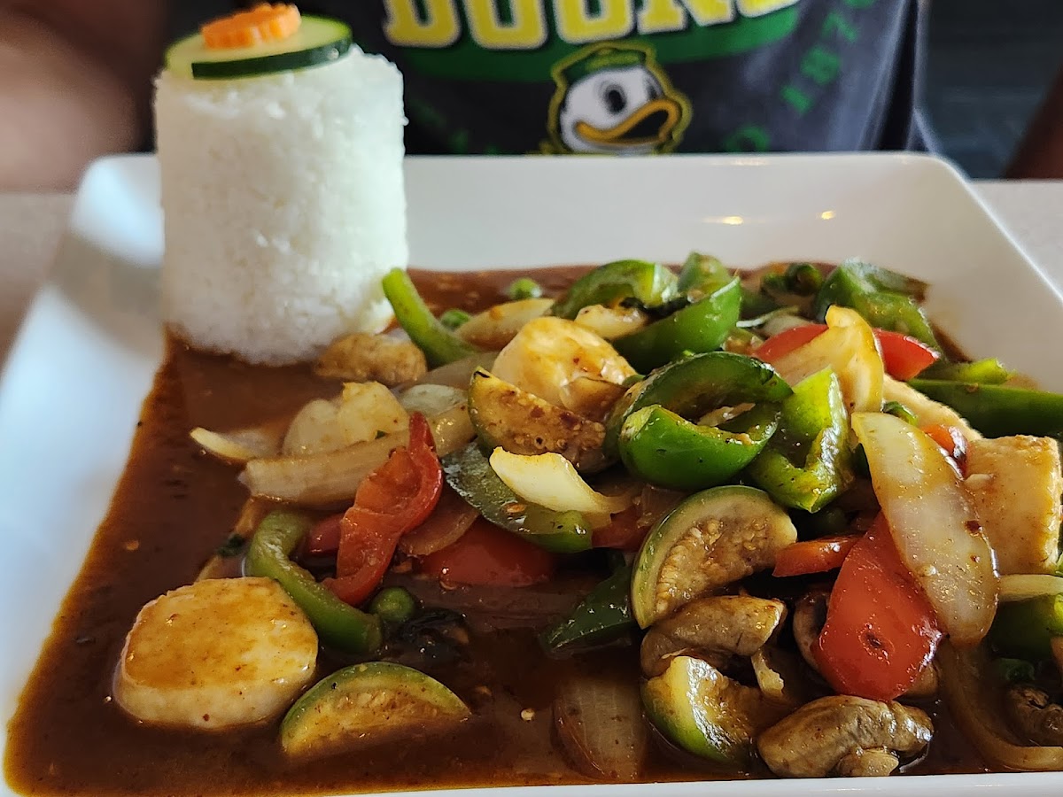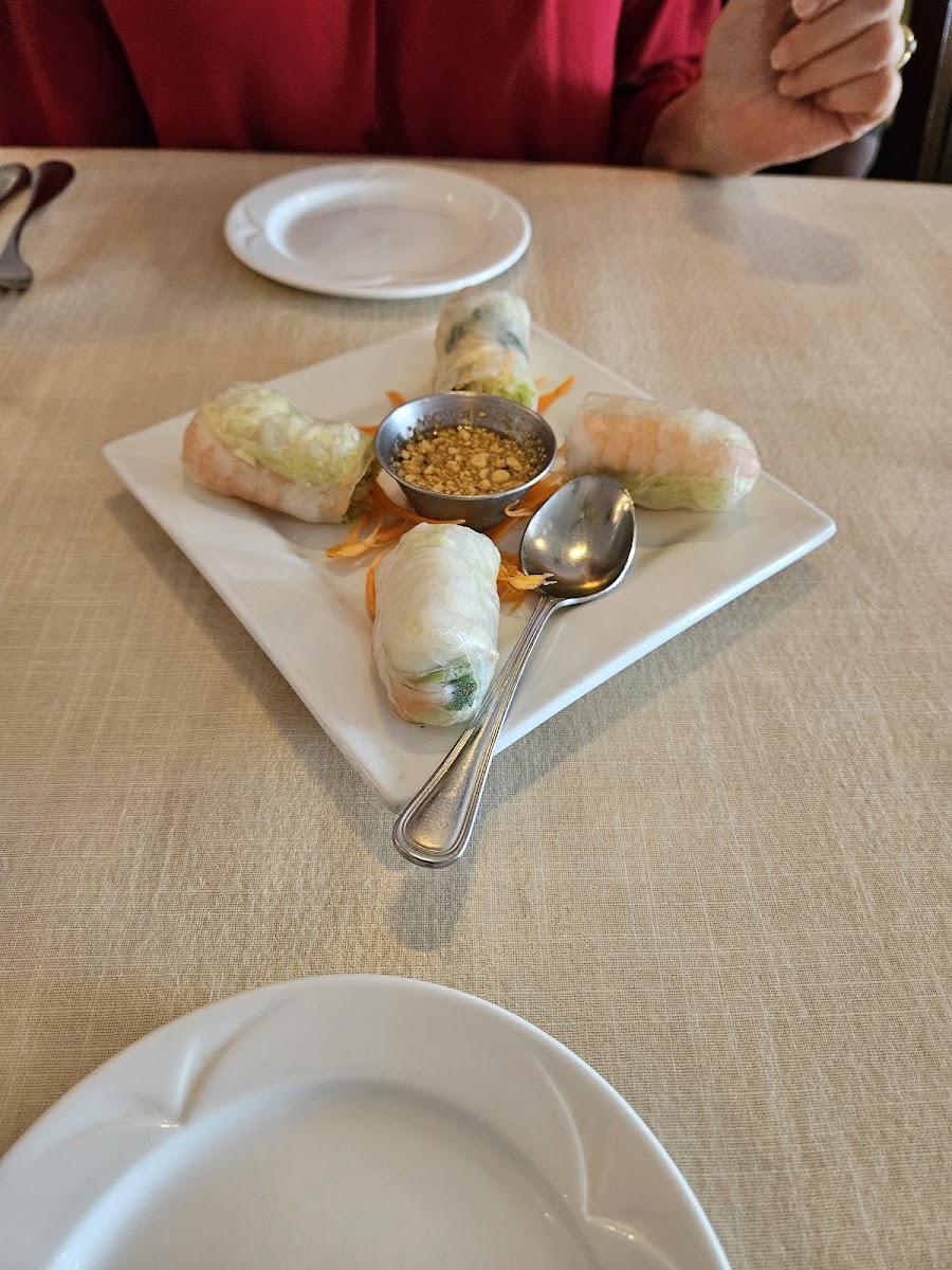 We had the pleasure of starting out with the fresh spring rolls, which were absolutely delicious and refreshing, and they came with a delicious vinaigrette-peanut sauce. Next, I had the spicy drunken noodles with chicken, and my partner had the hot pepper dish with scallops. Both were amazing, with nice, big portions. They were nice and hot, both temperature-wise and spice-wise. The waiter was so accommodating that they made a Thai iced tea for me with coconut milk because I was lactose intolerant. Thank you so much. Even though it's located in a strip mall, it still has a nice, elegant feel inside with a quiet atmosphere where you can hold a conversation at the table. All in all, we look forward to going back soon!